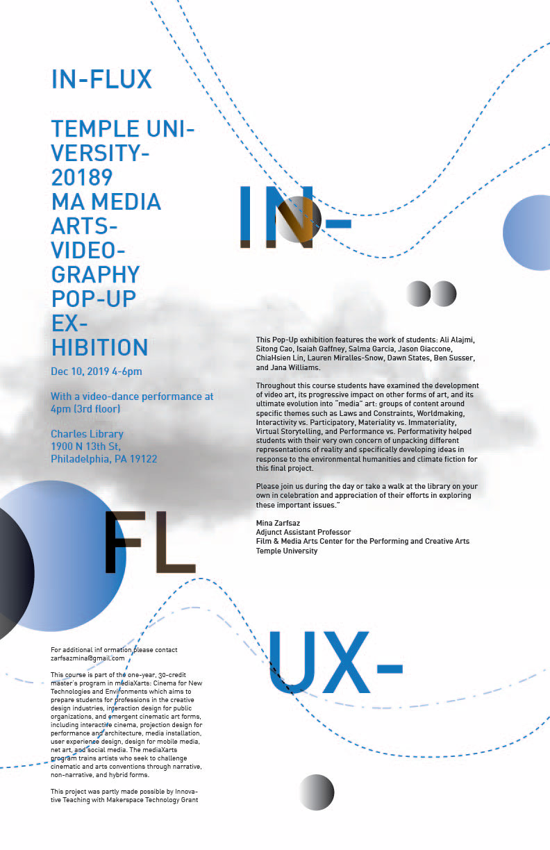 InFlux : Temple University 2019 . MA Media Arts Videography Final Exhibition at the Charles Library . Loretta C. Duckworth Scholars' Studio