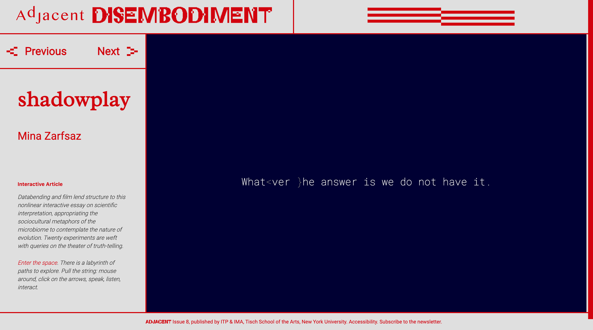 This is an experimental online experience exploring the speculative nature of sensory data in the sciences. It imagines a sociology of microbiomes, illustrating the parallel between their behaviors and human behavior, such as camouflage as a metaphor for anti-surveillance.