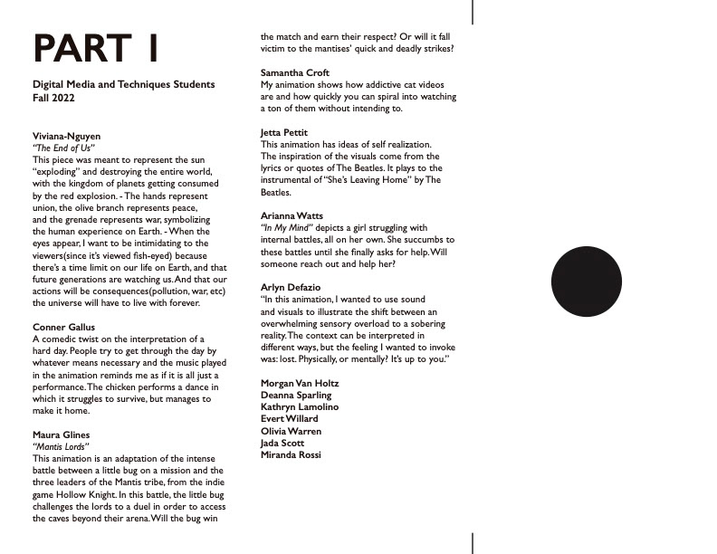 Animated Projections by my Digital Media & Techniques students in response to themes such as corporate greed, loss in the Anthropocene, and climate fiction paired with sonic visualizations.